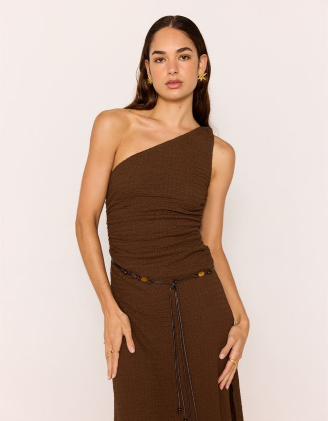 - One-shoulder neckline with ruched detailing
