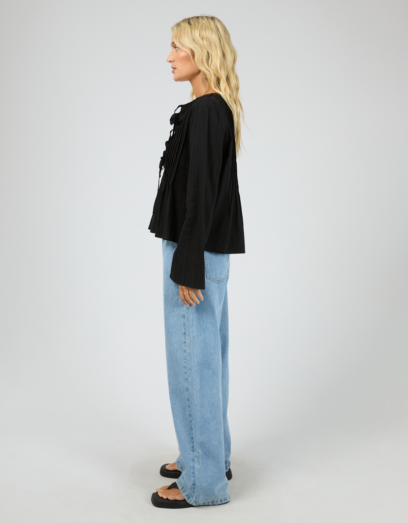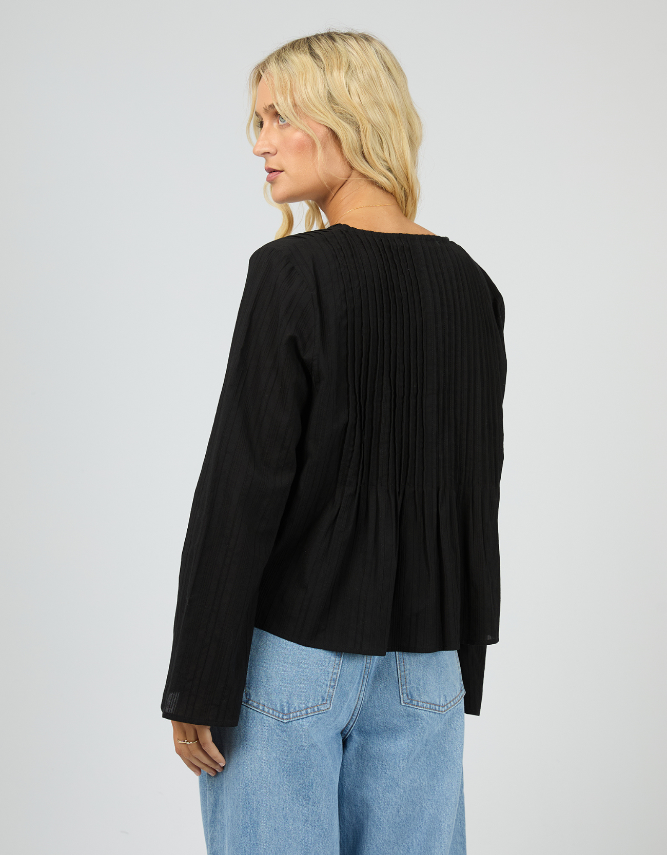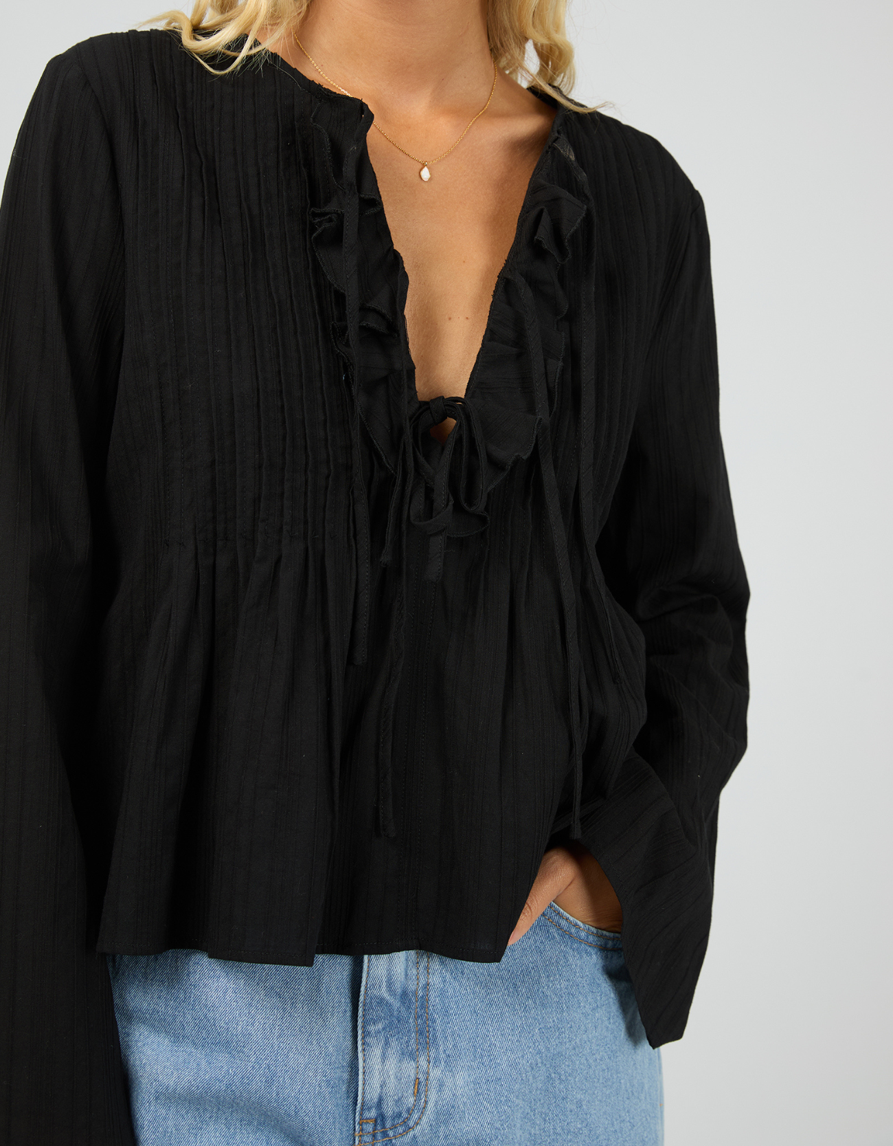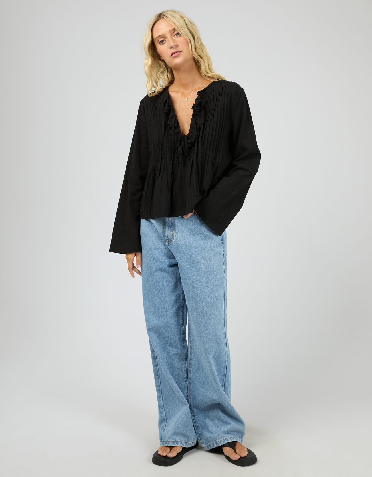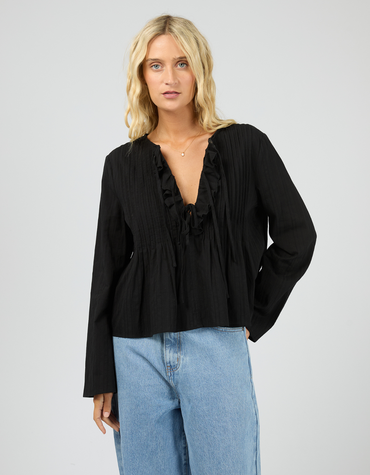Featuring a flattering V-neckline with ruffle trim, this top adds a feminine touch while the subtle pleating creates beautiful texture and flow through the body. The relaxed silhouette keeps it effortless and comfortable, while the long sleeves add an elegant finish.