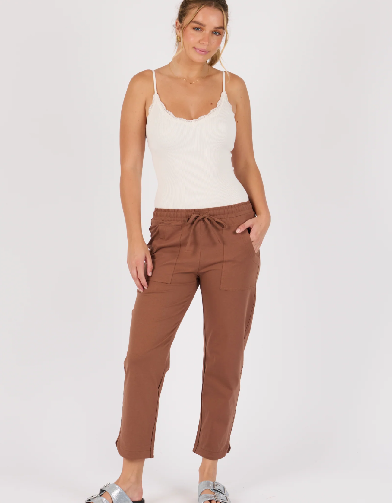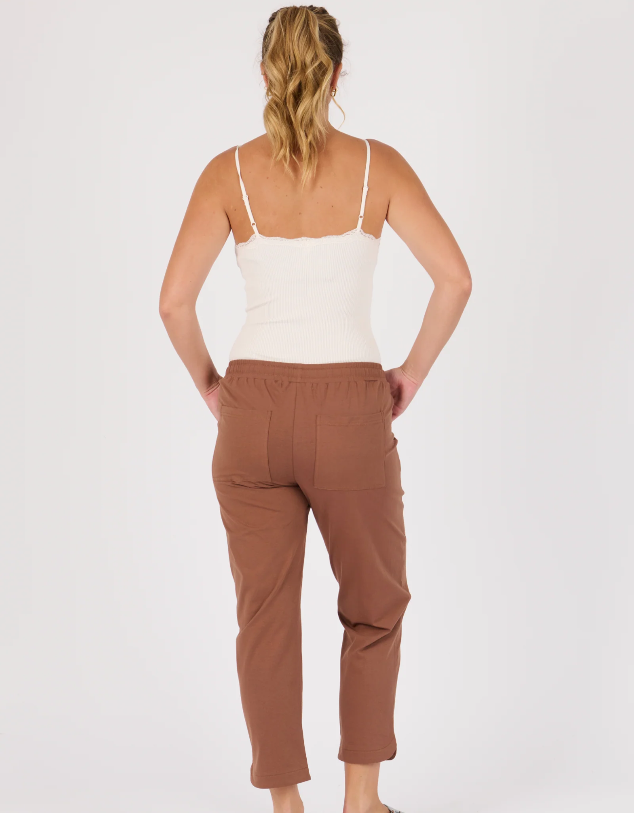 Introducing the Beach Pant in Acorn from One Ten Willow—the perfect blend of comfort, ease, and effortless style. Crafted from a soft and stretchy 95% Cotton, 5% Elastane blend, these pants offer breathable wear and a flattering true-to-size fit, making them ideal for everyday lounging or relaxed weekend outings.